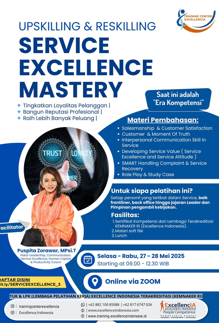 Pelatihan “Service Excellence Mastery” dari Excellence Indonesia dirancang untuk membantu Anda dan tim meningkatkan keterampilan pelayanan, komunikasi, dan manajemen kepuasan pelanggan secara profesional.